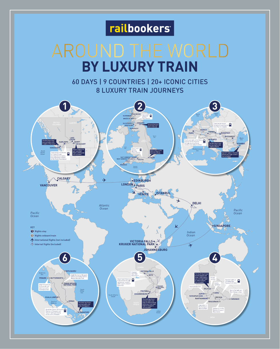 With Railbookers, your travel possibilities are boundless! Prepare for the adventure of a lifetime as you traverse four continents and 9 countries aboard luxurious trains. Over the course of slightly more than 11 weeks, you'll be immersed in a captivating journey that showcases the best of each destination. Be captivated by the breathtaking natural splendor of the Canadian Rockies, immerse yourself in the vibrant culture and storied history of Europe, indulge in the luxurious world of royal train travel in India, embark on exhilarating escapades in South Africa, and discover the enchanting allure of Southeast Asia's majestic wonders.