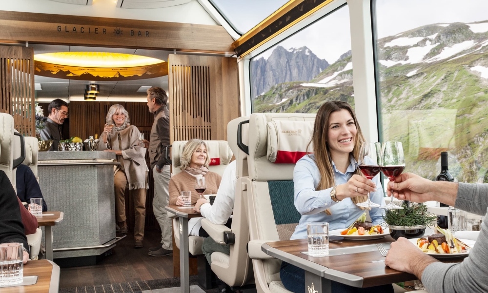 Panoramic carriages allow uninterrupted views of the landscape, while onboard dining highlights regional Swiss cuisine.