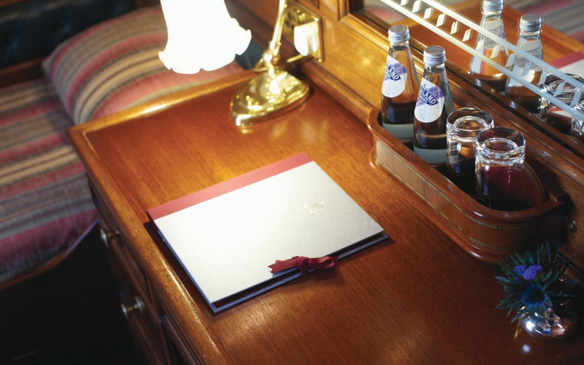Belmond Royal Scotsman luxury cabins provide a welcome sanctuary after a day in the Highlands. Lined with rich marquetry, each one features plush beds fitted with soft Scottish wools and tartans. An elegant dressing table, en-suite, and generous picture window add to the indulgence. Enjoy delicious Scottish cuisine from the chef's daily menu, as well as all alcoholic and non-alcoholic beverages, all included with your journey. With the train stabled at night in a station or quiet siding, you are assured with a good night's rest.